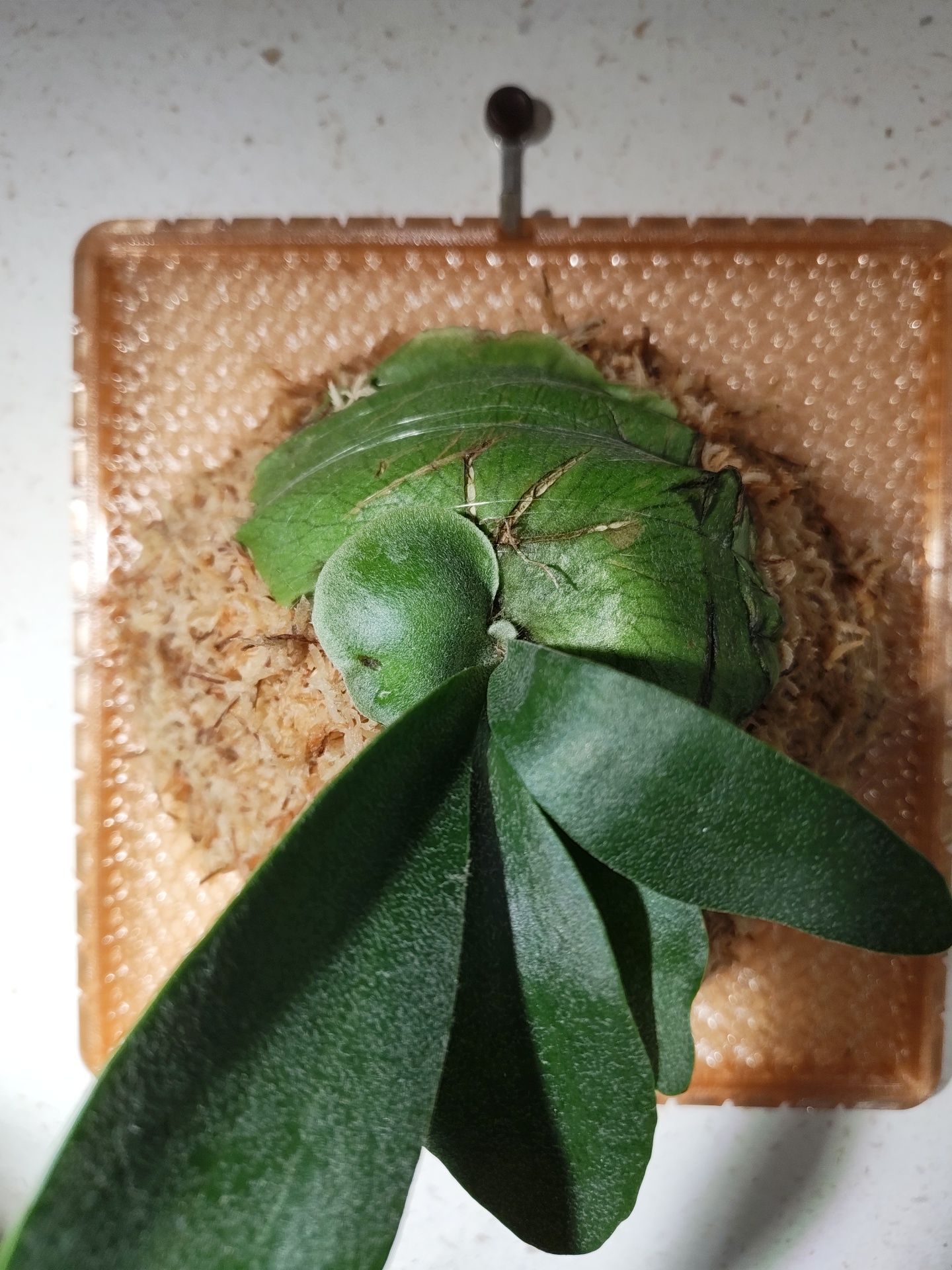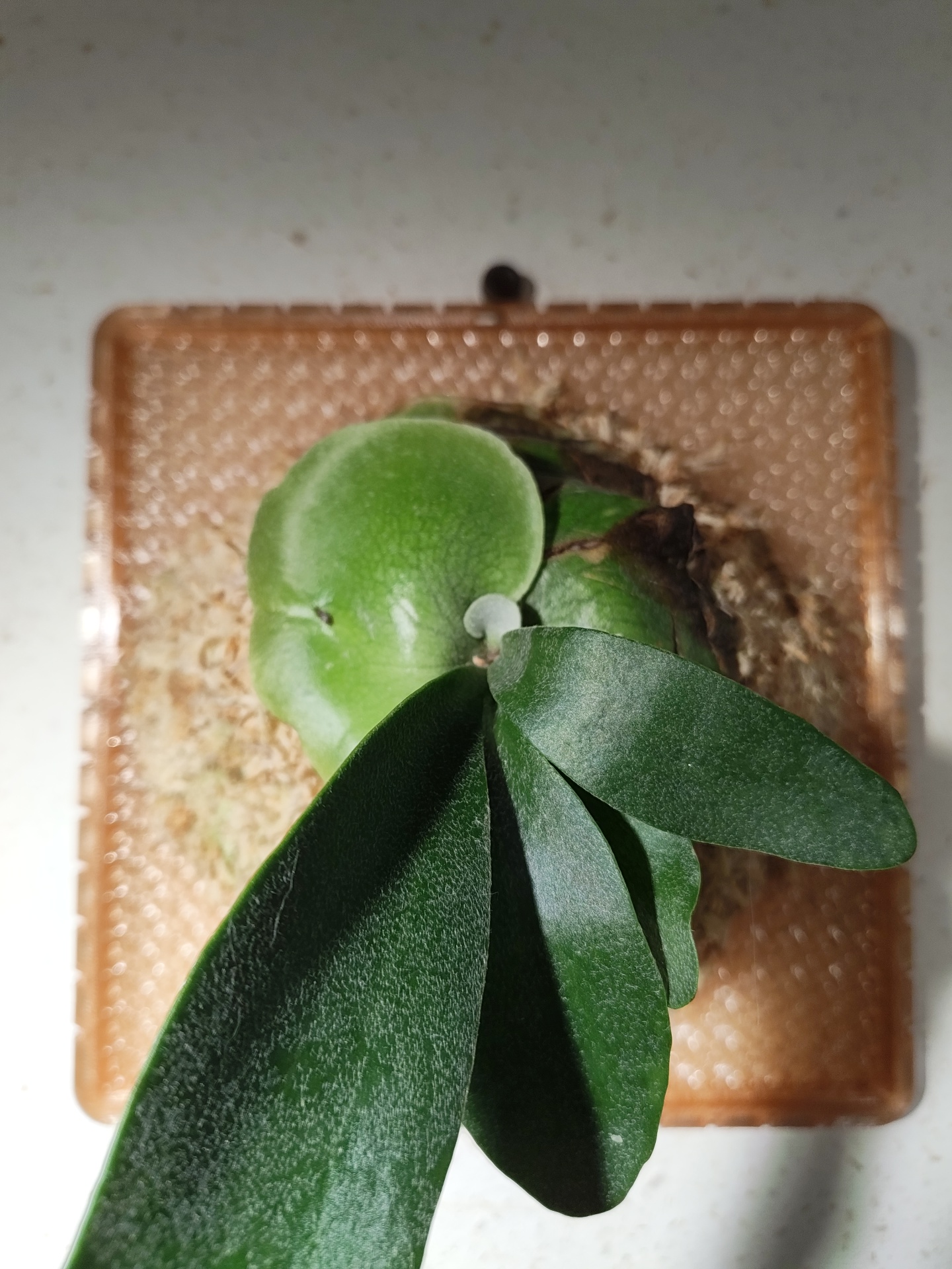 初めての練馬のオザキフラワーパークで買った子株です。フーンシキとラベルあり。並んでいた他の個体と比べるとかなり小さかった反面、非常に胞子葉が綺麗で貯水葉の展開が始まったタイミングだったのでこれを選びました。まだ分岐が始まってないのでこれからうねっていくのが楽しみ。