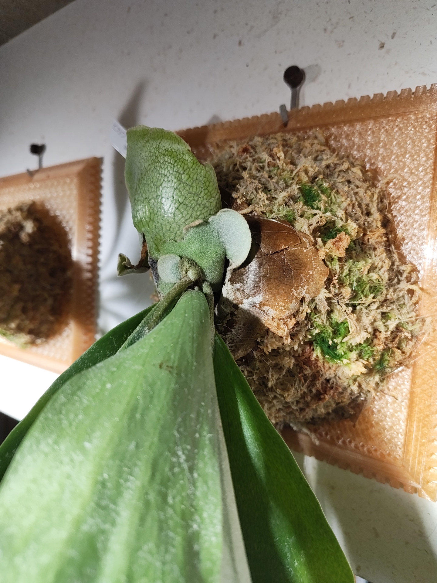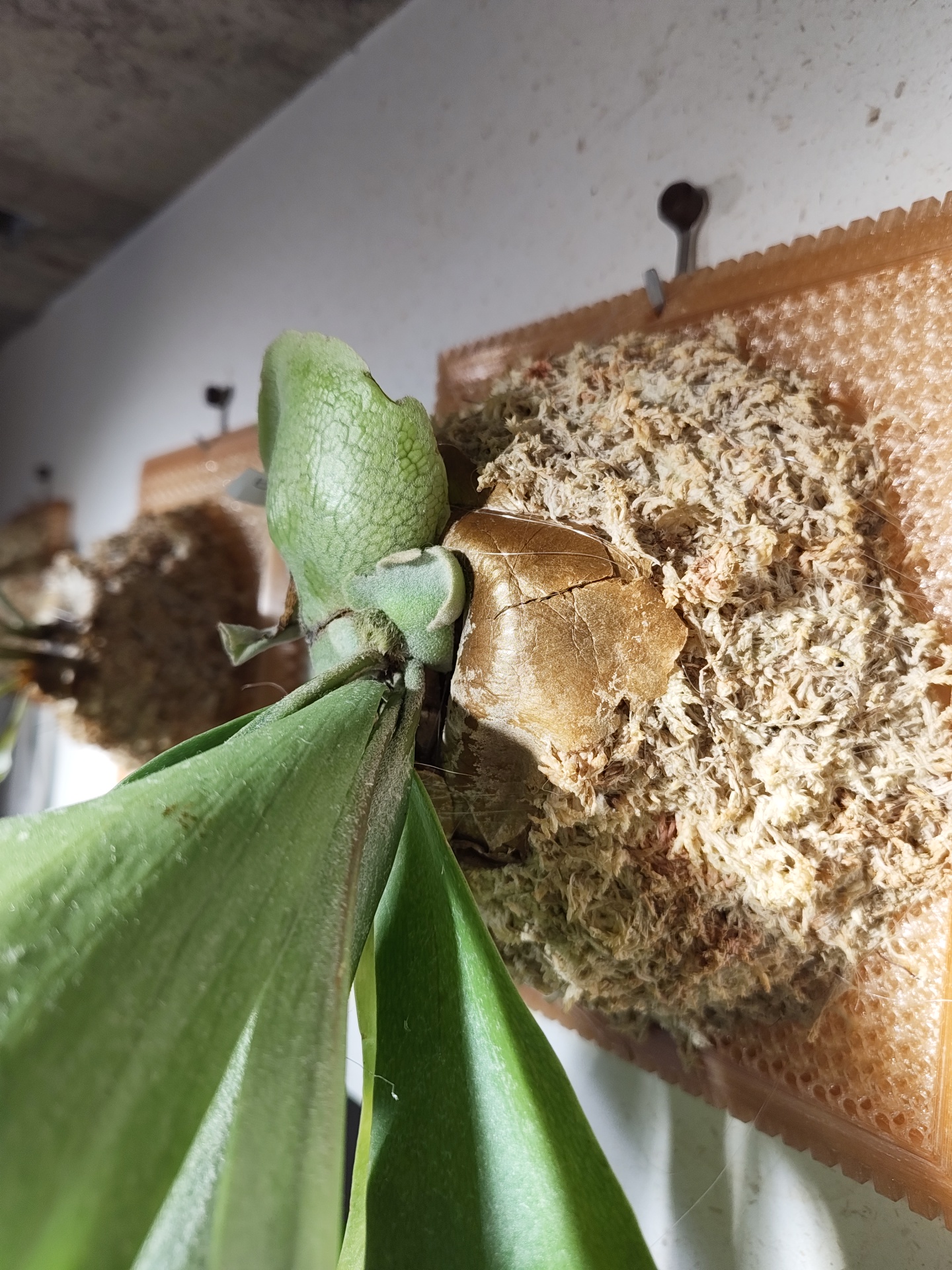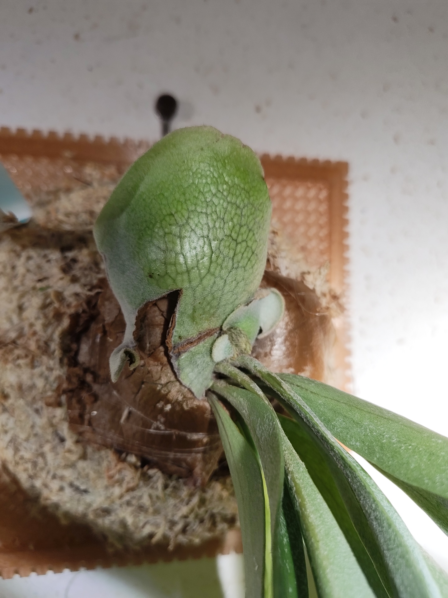 貯水葉は少しずつですが大きくなってきました。少し変形してるのは水苔の巻き方が悪かったかな。盛りすぎた気がします。でも貯水葉自体はいい色です。